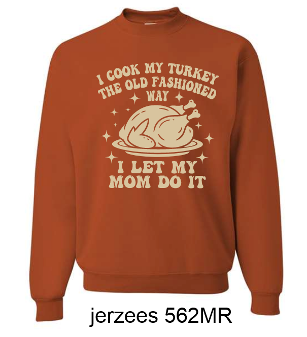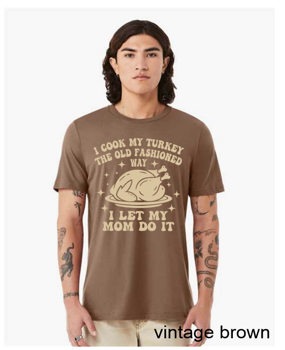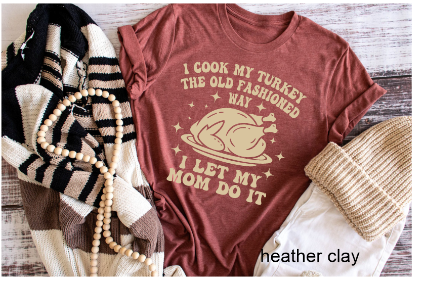 Serve up some laughs this Thanksgiving with our "I Cook the Old Fashion Way — I Let Mom Do It" shirt! 🦃 Perfect for anyone who loves the holiday feast… but not the cooking.