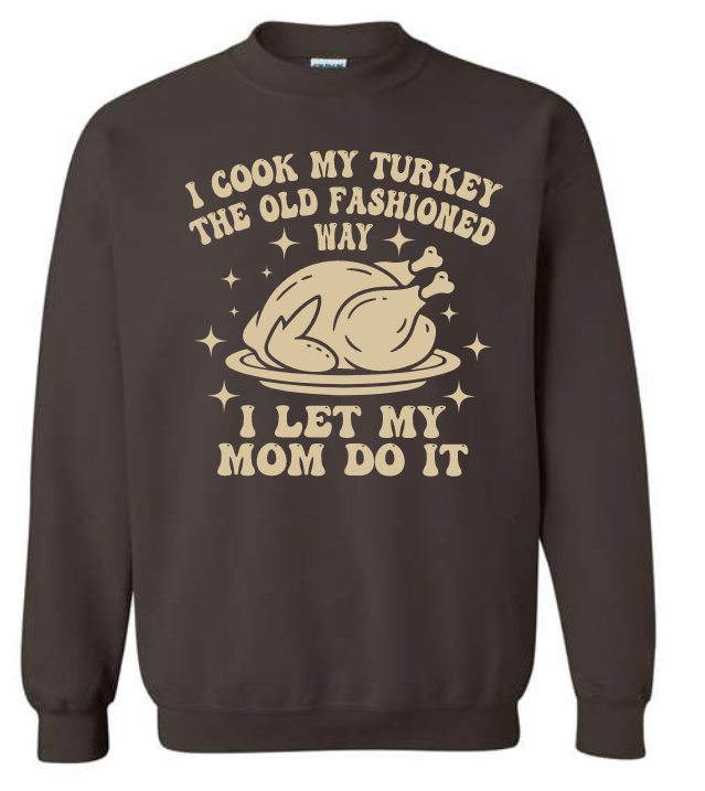 🦃 “I cook the old fashion way — I let Mom do it!” The perfect Thanksgiving tee or sweatshirt for the ones who show up hungry, not handy!