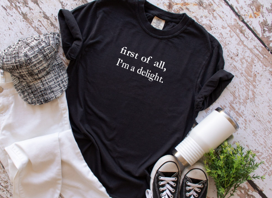 This Comfort Colors® short sleeve t-shirt features the phrase “first of all, i’m a delight.” Printed in a clean, minimalist style. Made with ultra-soft, garment-dyed cotton, this tee has a relaxed fit and that perfectly worn-in feel you love.