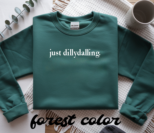 This Gildan® crewneck sweatshirt features the phrase “just dillydalling.” professionally embroidered in a clean, minimalist style. Soft on the inside with a classic unisex fit, this sweatshirt is perfect for lazy mornings, casual outings, or those days when productivity isn’t on the agenda.