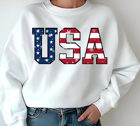 This  USA sweatshirt features a bold patriotic design filled with stars, stripes, and subtle snowflake details, making it perfect for winter sports season, holiday wear, or cheering on Team USA all year long.